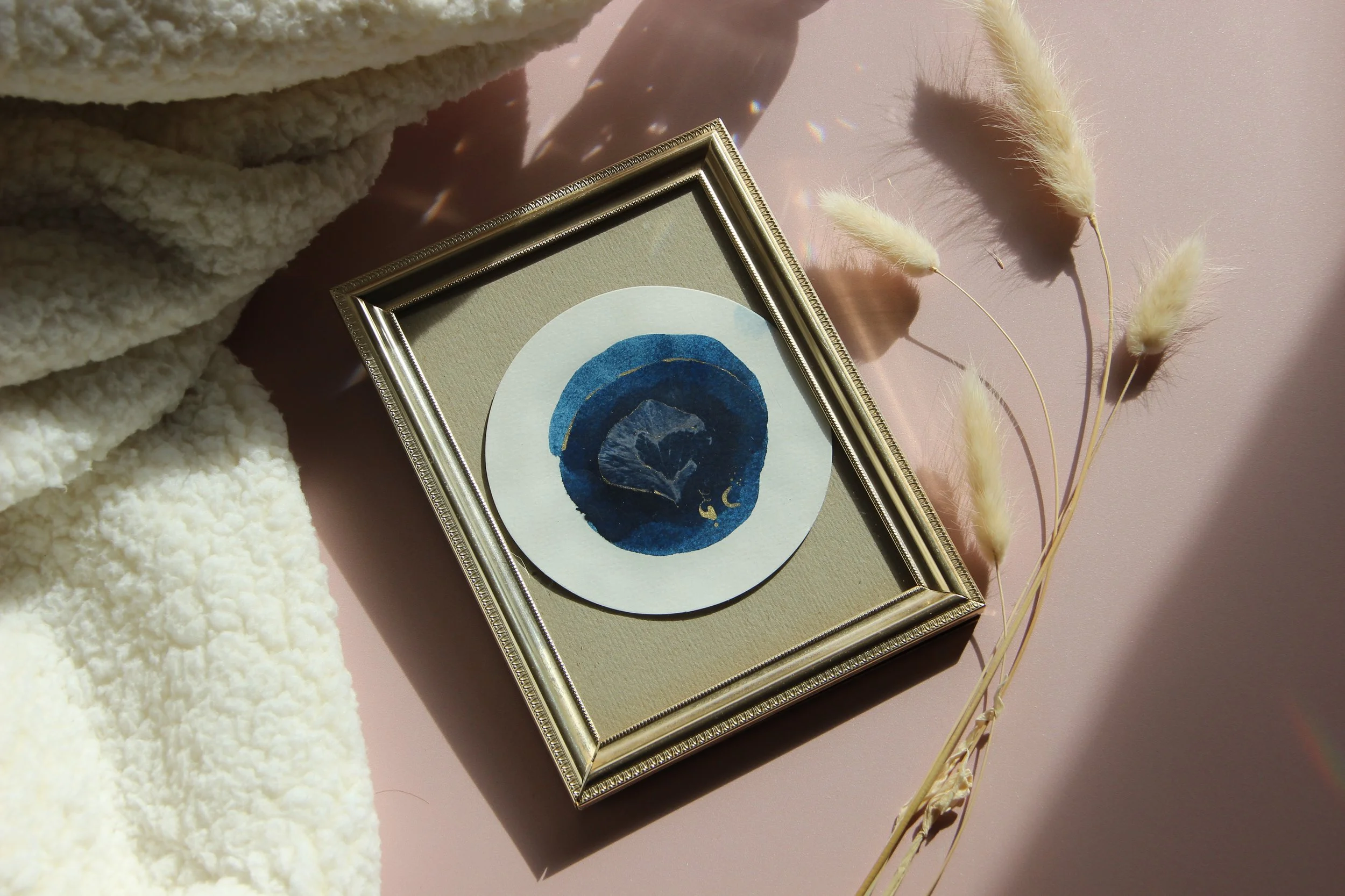 l’œuvre est exécutée sur papier d’art de qualité 300g/m², avec la technique du cyanotype et calligraphie dorée, format proche d’un A4.