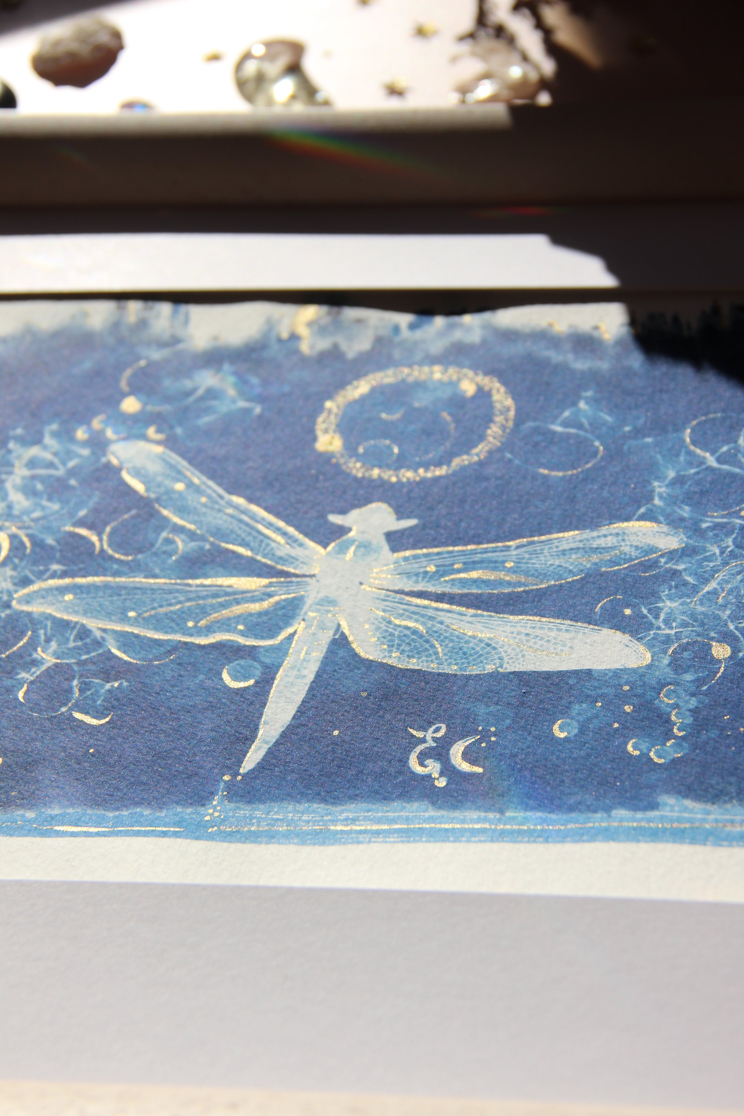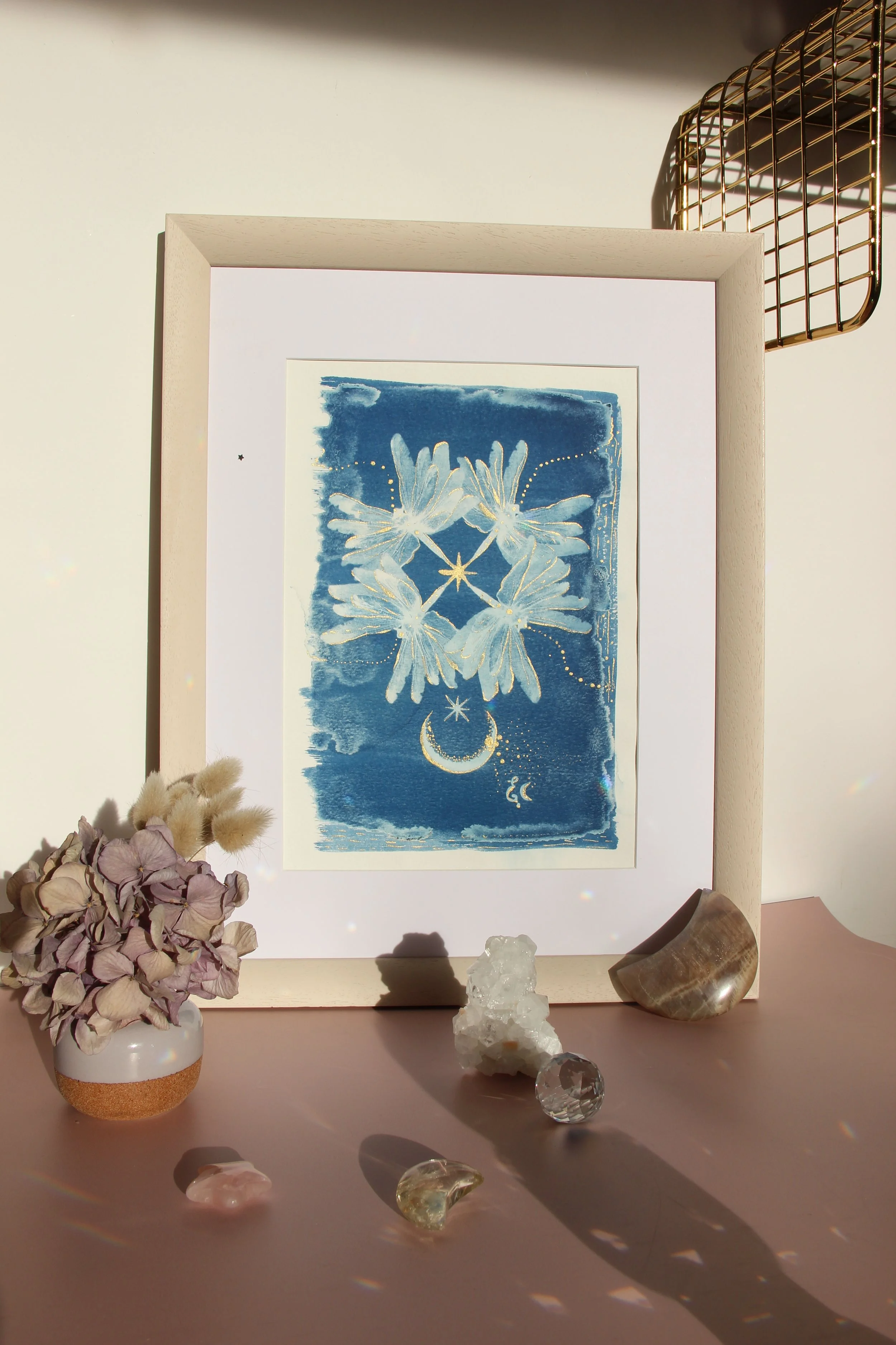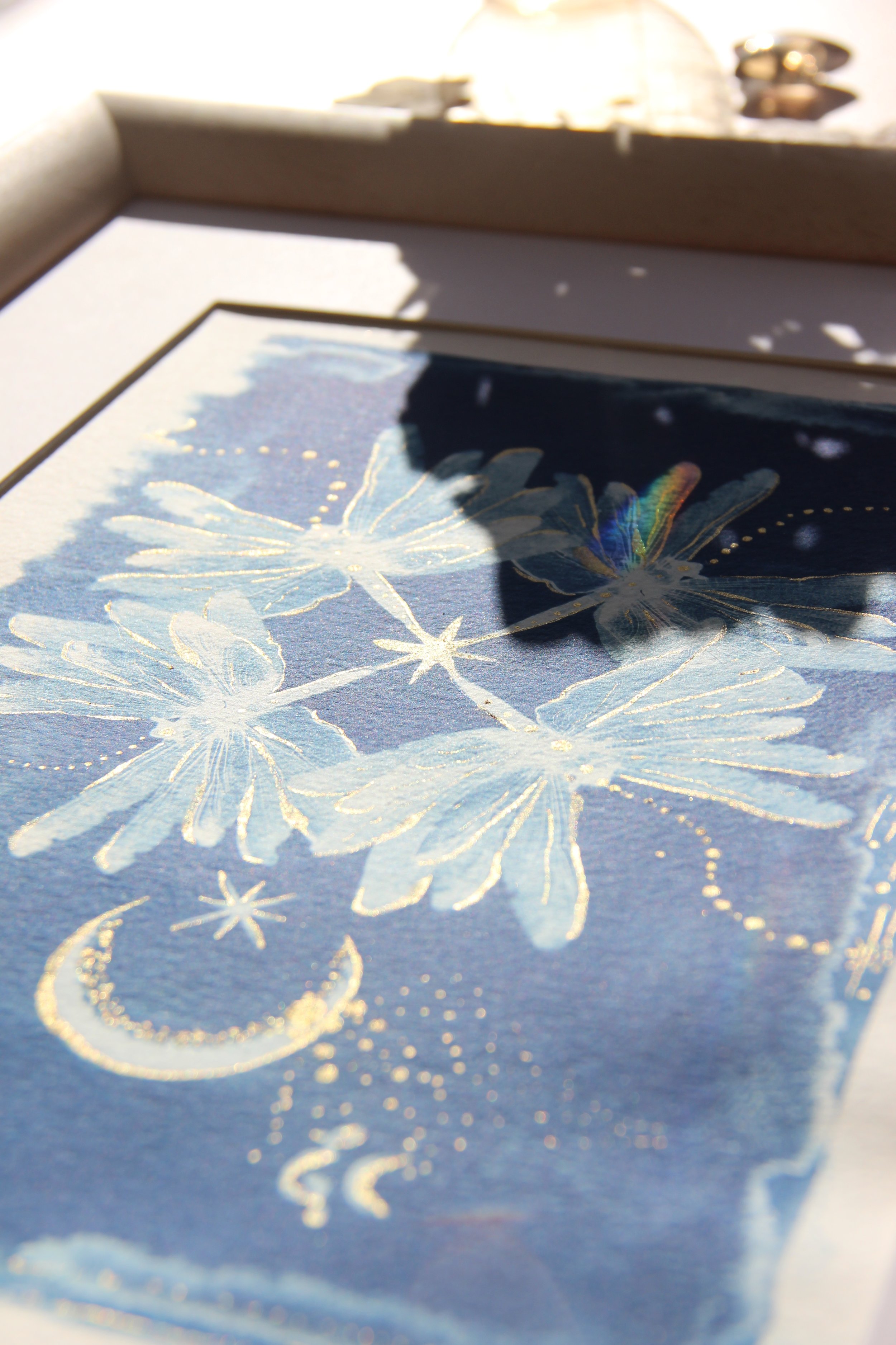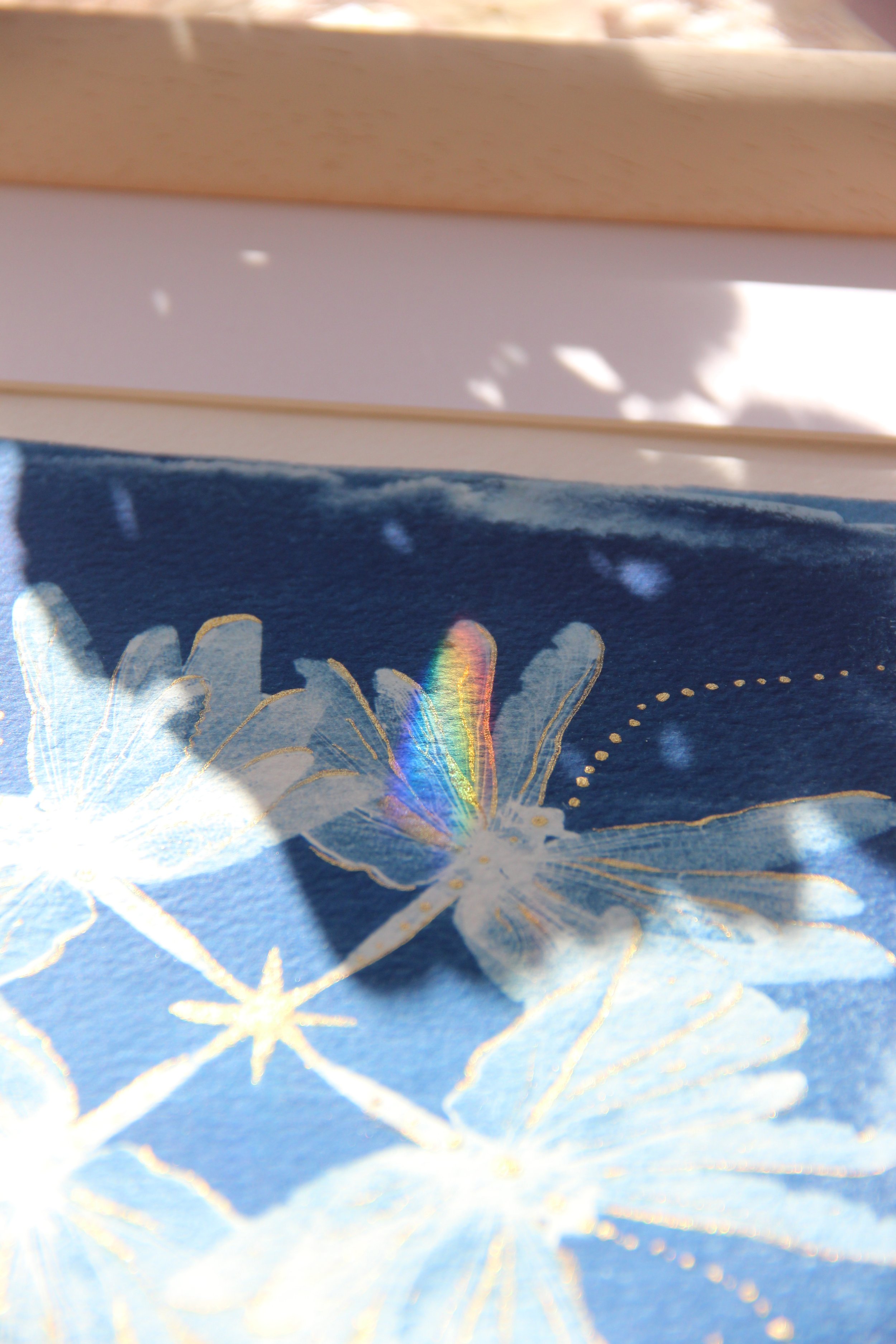 Œuvre originale sur papier d’art 300 g/m², technique du cyanotype et calligraphie dorée, format proche A4.