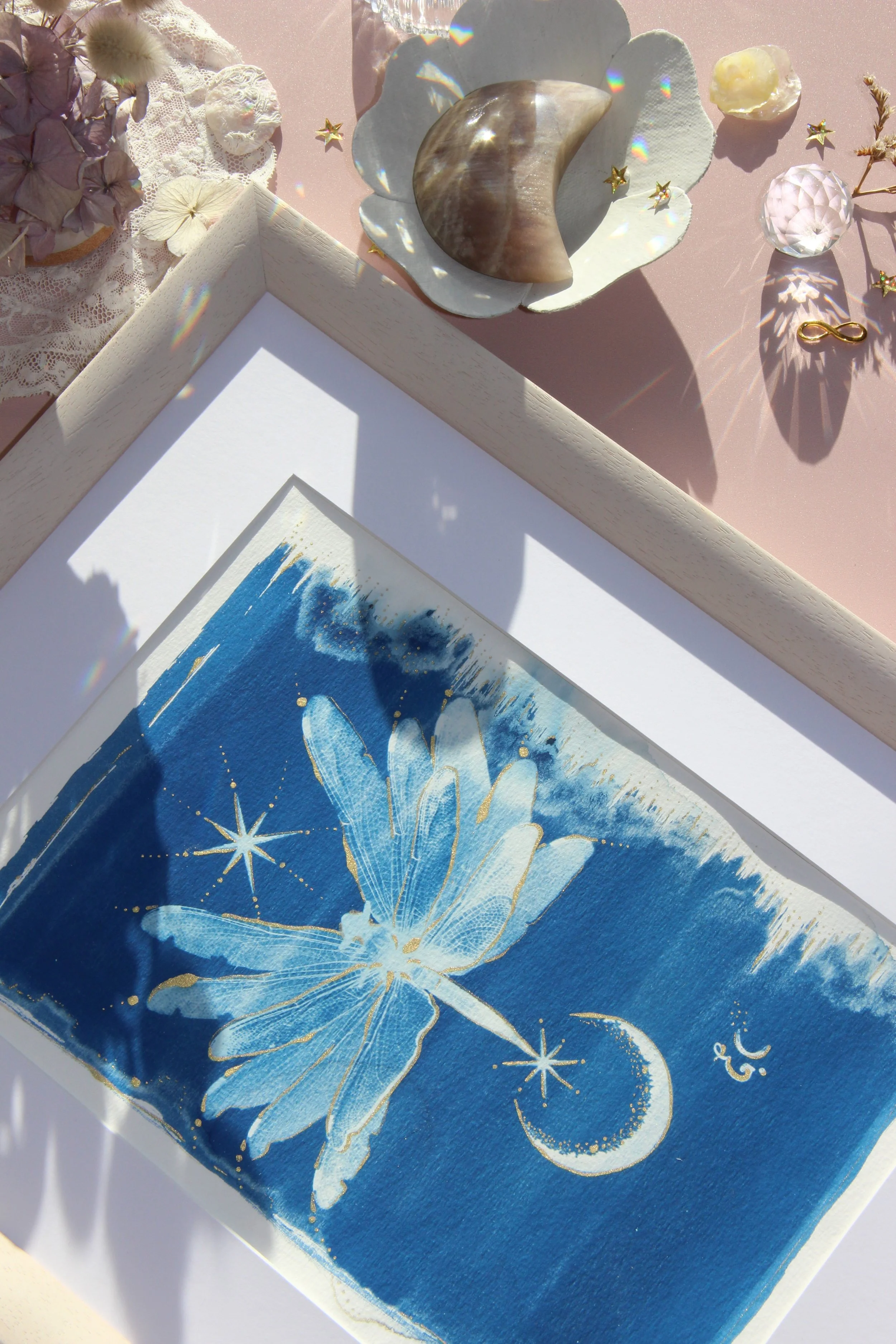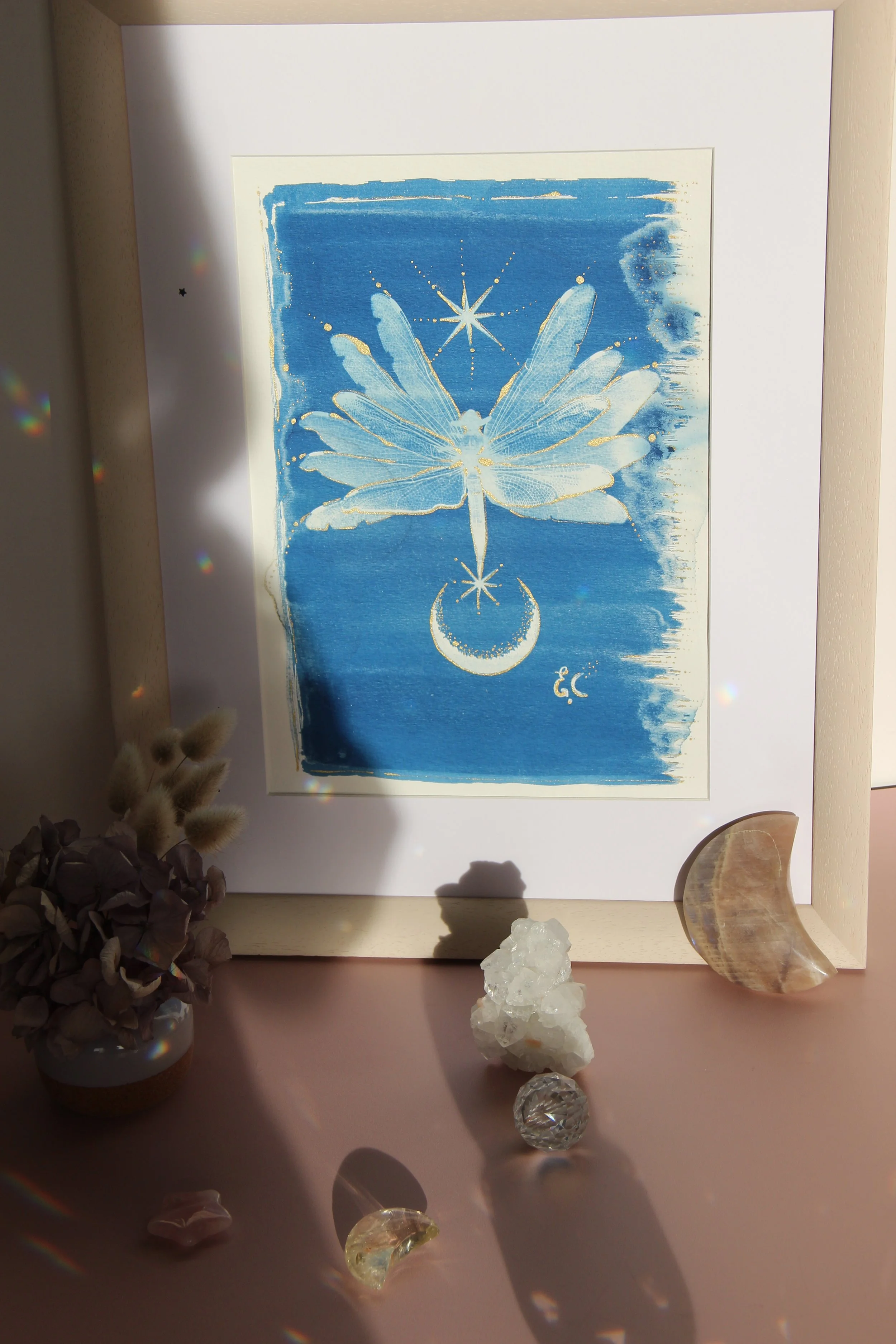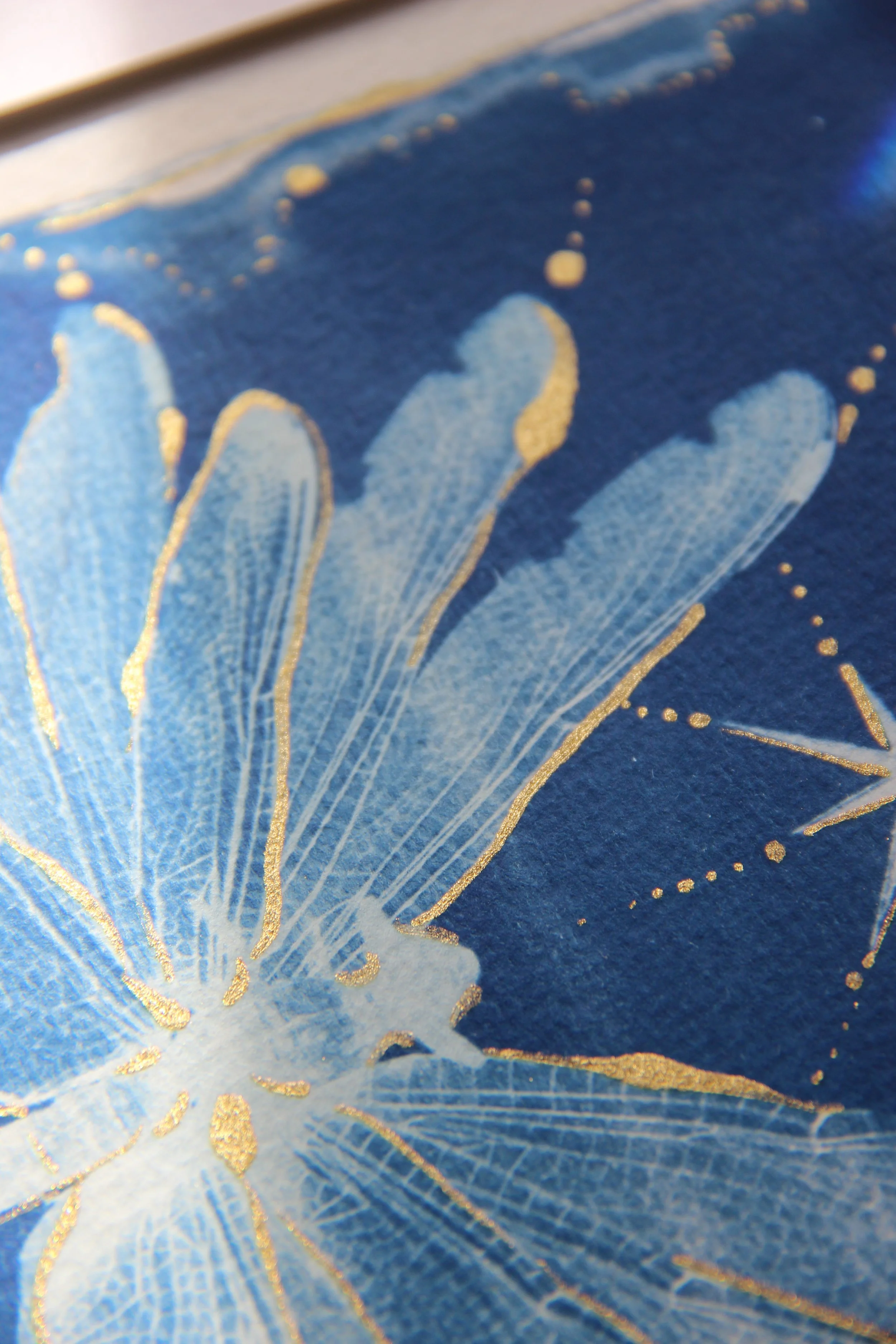 l’œuvre est exécutée sur papier d’art de qualité 300g/m², avec la technique du cyanotype et calligraphie dorée, format proche d’un A4.